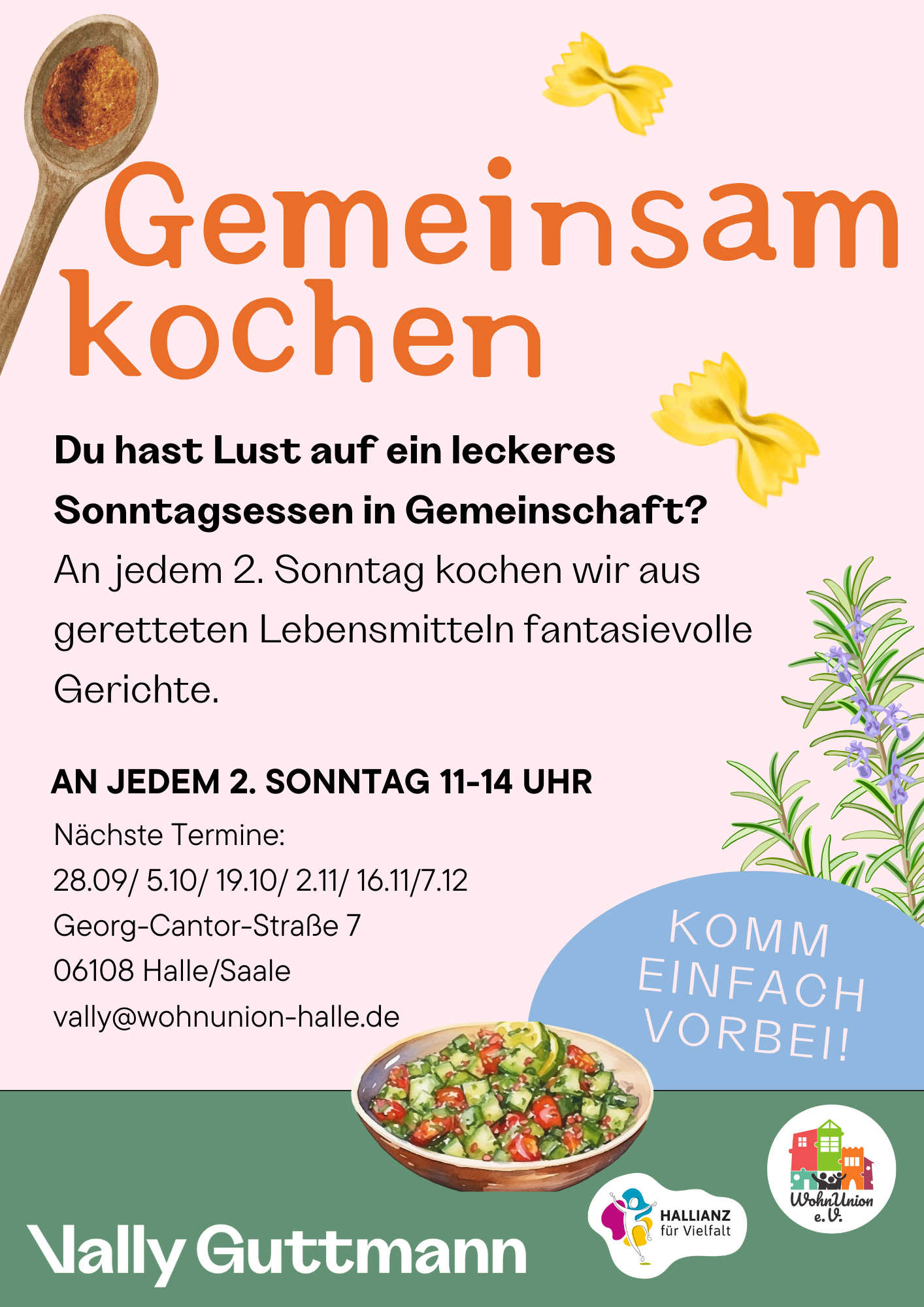 Das gemeinsame Kochen findet an jedem 2. Sonntag von 11-14 Uhr im VALLY Guttmann Nachbarschaftsraum statt.