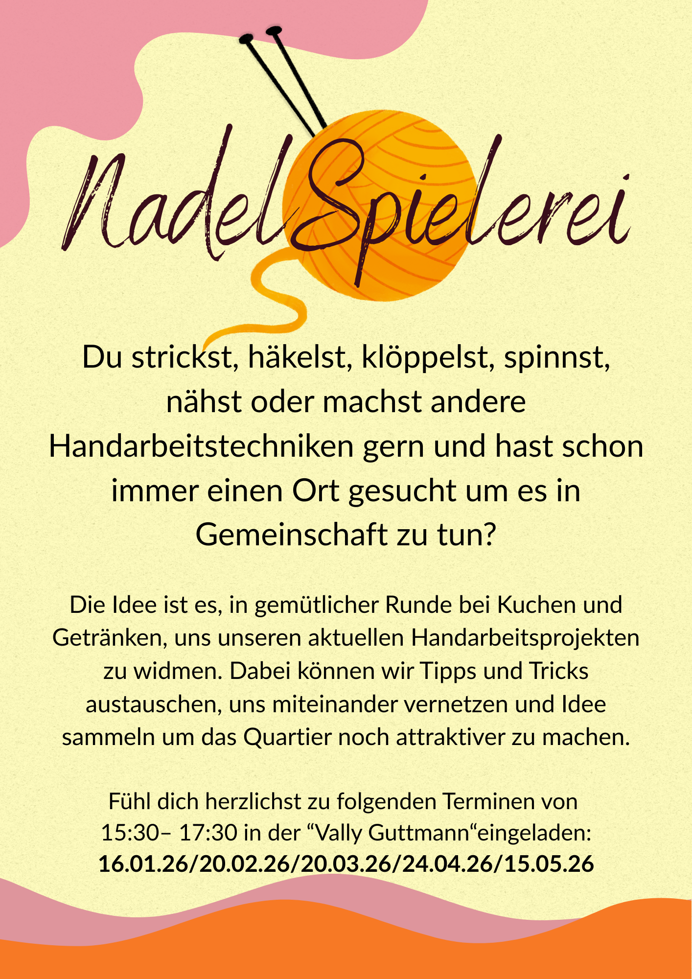 16.01.2026 / „NadelSpielerei“ – Gemeinsam ist manchmal besser als Allein“ Du strickst, häkelst, klöppelst, spinnst, nähst oder machst andere Handarbeitstechniken gern und hast schon immer einen Ort gesucht um es in Gemeinschaft zu tun? Diesen Raum wird es jeden 3.Freitag im Monat von 15:30 – 17:30 Uhr in der „Vally Guttmann“ geben. Die Idee ist es, in gemütlicher Runde bei Kuchen und Getränken, uns unseren […]