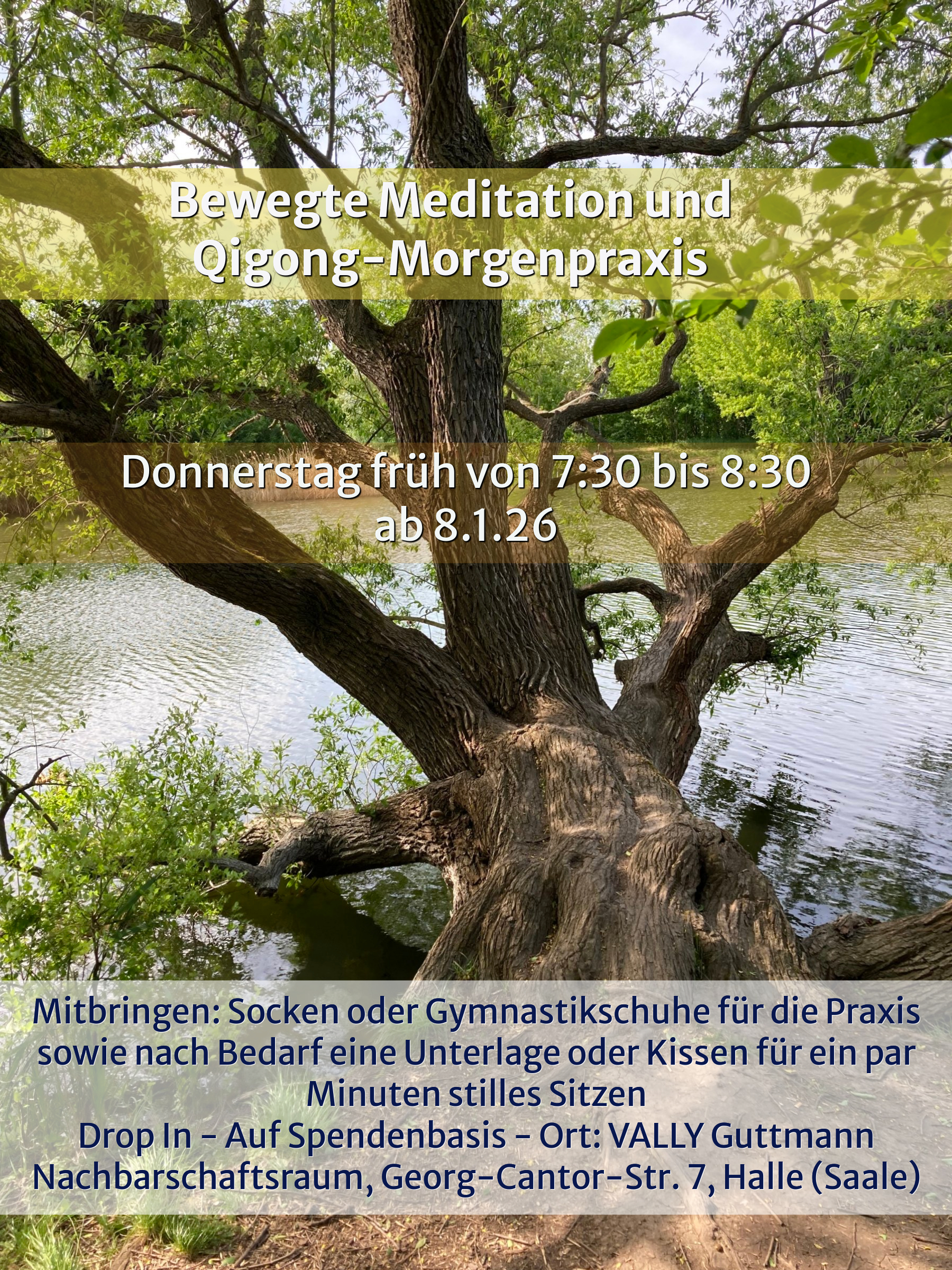 /22.01.2026 Herzlich Willkommen zu einer Stunde Morgenpraxis Qigong und Meditation - offen für Jede*n, keine Vorkenntnisse nötig. Die Übungen der alten chinesischen Bewegungskunst Qigong werden vorrangig im Stehen geübt - wir nehmen uns zu Beginn Zeit um bewegt im Körper anzukommen und lassen die Stunde in Stille ausklingen. Mitzubringen: Socken (ggf. rutschfest) oder Gymnastikschuhe, bei […]